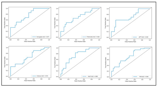 Table 3 and Figure 2 present the receiver operating characteristic plot for the variables involved in estimating the risk for preterm birth. The computed area under the curve (AUC) was above 0.600 in all six studied parameters, although none of them was higher than 0.700. Therefore, it can be considered that they have a poor discrimination, even though they have statistical significance. The highest value was observed to be represented by the HALP score with AUC = 0.680 and the highest sensitivity as well (75%, p-value = 0.001). The highest specificity was achieved by the prothrombin time (69%), and the HALP score was also 69%. The FAR score had an AUC of 0.646, with a sensitivity of 68% and specificity of 64% (p-value = 0.020). All other variables were significant estimates for the risk of preterm birth, although with lower accuracy.