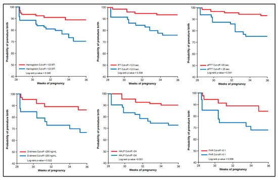 The risk assessment for preterm birth based on maternal serum parameters is presented in Table 4 as the regression analysis, while Figure 3 and Figure 4 describe the threshold for significance in premature birth assessment based on a Kaplan–Meier plot. Therefore, pregnant women with hemoglobin levels below 120 g/L (12.0 g/dL) had a 3.28 higher likelihood of giving birth prematurely (p-value < 0.001). A prothrombin time below 12.5 s determined a 2.11 times higher risk of preterm birth (p-value = 0.038). Similarly, the aPTT below 25 s was linked with 3.24 higher odds of giving birth prematurely. However, the strongest predictors were the D-dimers above 250 ng/mL (OR = 4.26), the FAR score below 0.1, with an odds ratio of 5.30, and the HALP score with a 6.09 OR for a cut-off value above 24 (p-value < 0.001).