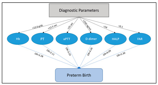 So far, the use of non-invasive methods to determine the risk of premature birth was established on the accuracy of serum parameters responsible for anemia and different scoring methods based on the inflammatory status of the pregnant woman, such as the Neutrophil–Lymphocyte Ratio, Monocyte-to-Lymphocyte Ratio, Platelets-to-Lymphocyte Ratio, Systemic immune–inflammation index, or the systemic inflammatory response index [14,15,16]. Therefore, the aim of this retrospective research is to determine the prognostic value of hemoglobin, the association of hemoglobin, albumin, lymphocyte, and platelets’ (HALP) score, and coagulation parameters such as the prothrombin time (PT), activated partial thromboplastin clotting time (aPTT), D-dimers, and fibrinogen to albumin ratio (FAR) for the risk of premature birth.