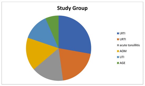 Diagnoses of patients in the study group that cause fever. LRTI: Lower Respiratory Tract Infection, URTI: Upper Respiratory Tract Infection, AOM: Acute Otitis Media, UTI: Urinary Tract Infection, AGE: Acute Gastroenteritis.