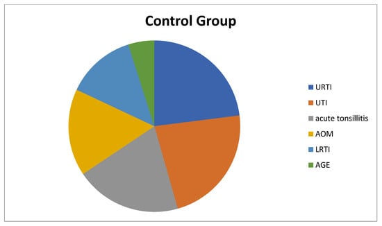 The children in the study group had the following health condition issues: 33 (54.1%) of the children had simple FS, 28 (45.9%) had complex FS, 68.8% had a family history of FS or epilepsy, 17 children had lower respiratory tract infection (LRTI), 12 children had upper respiratory tract infection (URTI), 10 children had acute tonsillitis, 10 children had acute otitis media (AOM), 8 children had urinary tract infection (UTI), and 4 children had acute gastroenteritis (AGE) (Figure 1). On the other hand, of the children in the control group, 14 children had URTIs, 14 children had UTIs, 13 children had acute tonsillitis, 11 children had AOM, 8 children had LRTIs, and 1 child had AGE (Figure 2).