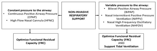 Nasal Continuous Positive Airway Pressure (nCPAP) provides continuous positive pressure to the infant’s airways throughout the respiratory cycle, using a noninvasive interface. It allows optimizing FRC and stabilizing the airways, reducing upper airway resistance, obstructive apnea, and alveolar collapse. It also decreases the work of breathing and improves the ventilation–perfusion ratio by decreasing intrapulmonary shunting [20,21,22,23].