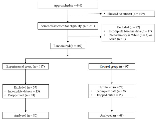 Initial recruitment efforts included reaching out to 640 Latinx and Black youth and their caregivers who received information about the study (Figure 1). Out of the contacted 640 parent–child dyads, 231 (36.1%) pairs expressed an interest in participating in the study orientation. At baseline, 17 participants dropped out and had incomplete data, and 5 participants were excluded for not meeting ethnicity requirements, thereby reducing the sample to 209 children. The remaining 209 children were randomly assigned to either the EG (n = 117) or CG (n = 92). After randomization, the final analytic sample was reduced to 148 participants due to 61 children (nEG = 37, 31.6% of EG participants; nCG = 24, 26.1% of CG participants) being excluded as a result of missing key post-intervention measures (nEG = 13, nCG = 9), or for dropping out of the study (nEG = 24, nCG = 15). Reasons for dropping out included children having time conflicts with competing academic and sports demands, school truancy, losing interest, and having unreliable transportation. Results from a sensitivity G*Power (F test, repeated measures ANOVA, within-between interaction) with the present sample size of n = 148, alpha error probability of 0.05, power of 0.8, and average correlation among repeated measures of 0.5 showed that a required effect size f of 0.12 is considered statistically significant.