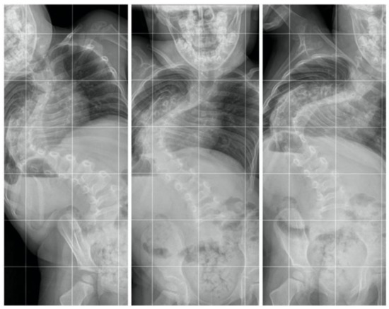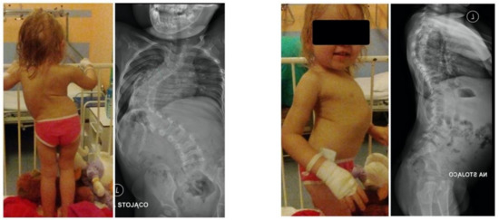 A 2-year-old girl was admitted to our clinic with rapidly progressive thoracic scoliosis. Previously, the patient had undergone conservative treatment with a brace and physical therapy. The patient had no other disorders. The major curve of the thoracic spine Cobb angle was 70° at 16 months of age, 100° at 22 months, and 122° at 30 months (Figure 1).
