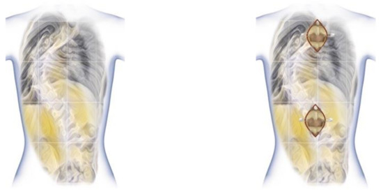 We placed the patient in a prone position on a Jackson table according to the standard procedure. Each procedure is carried out under the control of the neuromonitoring of the spinal cord. We selected the levels of stabilization of the upper and lower screws before the procedure, and after the analysis of the examined patient, we took X-ray images in the standing position and after assessing spine flexibility on the bending films. Then, after positioning the patient under the control of the C-arm, we marked the screw location levels on the skin, usually T2–T4 and L1–L3. Then, we made a skin incision, usually about 4–5 cm long (depending on the child’s height), to gain access to the levels of screw implantation only (Figure 5).