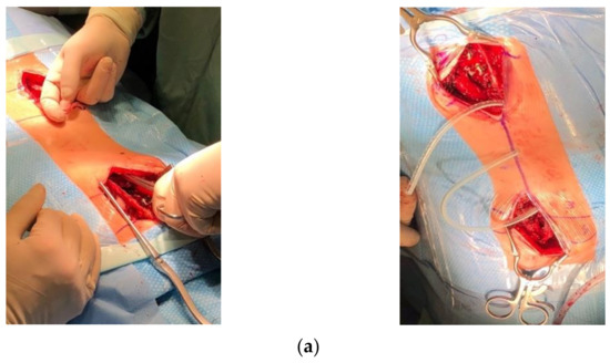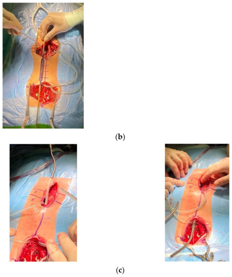 (a) Intraoperative pictures: using a paean, we created rod tunnels immediately under the fascia not reaching the spine. (b) Using drains as a guide for the insertion of temporary MCGRs. (c) Inserting MCGRs followed by drains.
