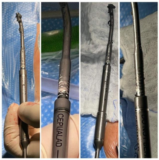 The next step is to properly cut and bend the magnetic rods. We always use one standard rod and one offset rod. After measuring and cutting the MCGRs, we need to test the efficiency of the rod distraction actuator. The testing of the actuator should be performed before bending the rods and after their proper modeling and contouring to exclude possible damage to the mechanism during the bending of the rod. A very important element of bending the rods is modeling the rods 1 cm above and below the ends of the actuator. This is to prevent mechanical damage to the actuator. However, this method is not perfect, and due to the inability to bend the actuator in any way, we must contend with a completely straight part of the rod with a length of 90 mm or 110 mm, depending on the type of rod used. Another important element is to plan the implantation of magnetic rods in such a way that the actuators of the rods are preferably at the same height. After the rods are properly prepared, we are able to proceed with their insertion. Our technique involves placing the first rod on the left side for right-sided curves and vice versa for left-sided ones. For this patient, we led the rod through the previously prepared tunnel, placing the end of the drain on the end of the rod (Figure 6a–c). We led the rod in the cephalad direction. After affixing the rod to the heads of the screws, we derotated it to an adequate sagittal position and temporarily blocked it. Subsequently, we repeated the process on the opposite side with the second rod. After rod insertion, we performed a gentle distraction distally across the base after the proximal set screws and finished final tightening. We do not routinely use a proximal cross-connector between the rods. For patients with poor bone quality, we use transverse process hooks at the top for the prevention of upper implant pull out. We then completed the final irrigation, the decortication of the bone at the screws, the covering of the bone grafts with vancomycin powder, and a standard closure. During surgery, we used safety distraction for the neuromonitoring of the spinal cord. There were no changes in the SSEP and MEP. No postoperative complications occurred. The patient was discharged on the sixth day after surgery with a brace (for three months). We started distraction after three months. We distracted the MCGRs with the external remote control (ERC) by 1.5–2.5 mm every 8–10 weeks. The radiographic parameters are listed in Table 1. Between 2017 and 2022, 28 distractions were performed (48 mm total).