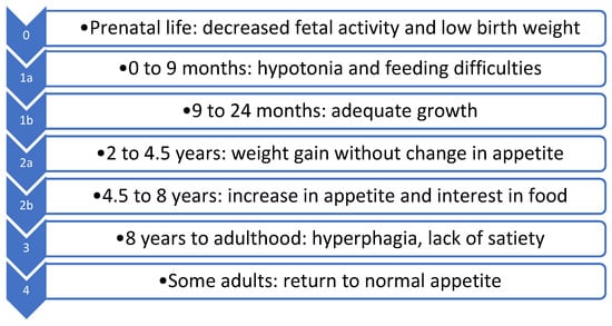 In early childhood, children affected by PWS rapidly gain weight, although no change in appetite is observed (indeed, appetite is considered appropriate for age). However, in the following phases, weight gain continues in parallel to an increase in appetite [8,48].