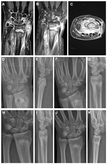 MRI imaging 4 weeks after K-wire removal after initial closed reduction and K-wire fixation of a dislocated distal radius fracture in an 11-year-old girl (A–C). Abscess formation in the distal metaphysis of the radius with intensive periosteal reaction (A,B) and affection of the growth through the K-wire channel. Axial section revealed strong abscess into the palmar soft tissues (C). Post-operative X-rays show filling of the metaphyseal defect area with a PMMA spacer (D,E). The spacer was exchanged against a hydroxyapatite–calcium sulphate biomaterial 9 weeks after stage 1 (F,G). After 6 weeks, there was already good remodeling of the metaphyseal bone zone (H,I). At midterm follow-up of 16 months, there was correct alignment of the wrist joint with premature closure of the growth plate (J,K).