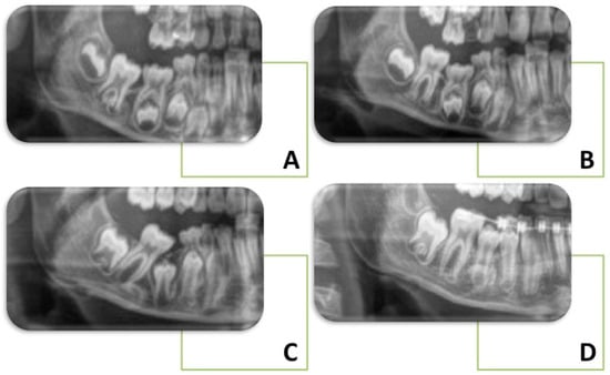 Detection of infraocclusion is generally established through the clinical finding of the tooth submersion under the clinical plane, percussion testing, and radiographic evidence. When percussed with metallic instruments, the typical sound of a “cracked teacup” characterised the infraoccluded tooth [26]. Radiographic parameters are usually obtained from orthopantomography and periapical radiographs. Radiographic criteria in orthopantomography are: the step between the infraoccluded tooth and the adjacents, the common bilateral presentation, and the presence of obliteration of the periodontal ligament [27,28]. Examination of an orthopantomography can help identify other dental anomalies. Cone-beam computed tomography (CBCT) images can be used as an additional diagnostic tool to best visualise the impacted tooth before surgical procedures.