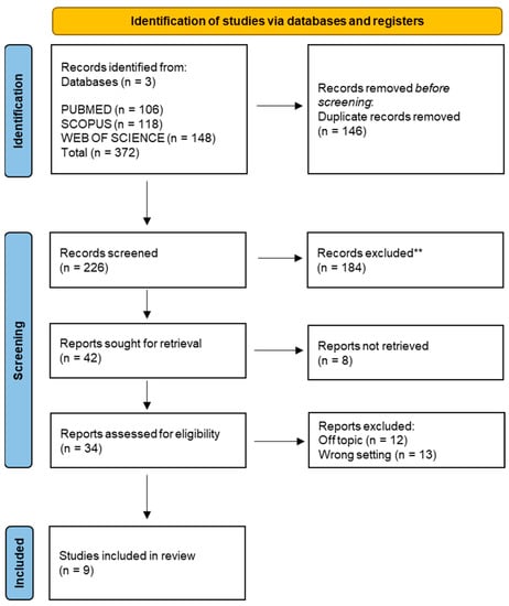 A total of 372 publications were identified from the following databases, including Pubmed (106), Scopus (118), and Web of Science (148), which led to 226 articles after removing duplicates (146). The title and abstract analysis excluded a total of 192 publications. The remaining 34 articles were successfully sought for retrieval and were assessed for eligibility by the authors. Twelve publications were excluded from the process because they were off-topic, eight others because they were prevalence and correlation studies, and five because they focused on the diagnosis and not on the treatment of infraocclusion. A final number of nine studies were included in the review for qualitative analysis (Figure 3).