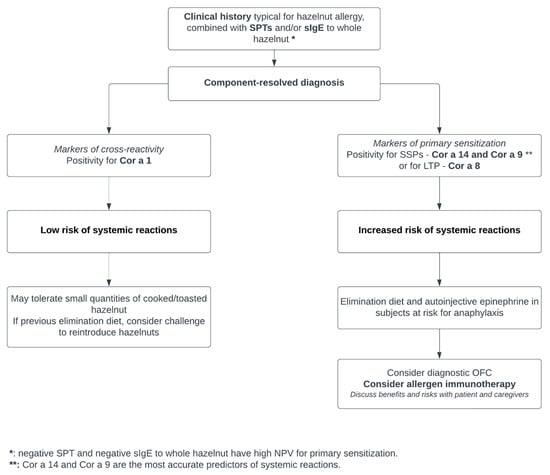 Recent studies continue to widen our understanding of allergen components of hazelnut with a growing impact on clinical decision making. Component-resolved diagnosis (CRD) may distinguish different sensitization profiles and may help to recognize the primary allergy. It may also be useful for stratifying patients according to the risk of severe reactions. Ten hazelnut allergens have been biochemically identified and classified as proteins or glycoproteins and are named Cor a 1, Cor a 2, Cor a 8, Cor a 9, Cor a 10, Cor a 11, Cor a 12, Cor a 13, Cor a 14, and Cor a thaumatin-like protein (TLP). The commercially available hazelnut component-sIgE includes those to Cor a 1, a PR-10 that is sensitive to gastric digestion and heat labile [8], to Cor a 9 and to Cor a 14, that are both SSPs, and to Cor a 8, that is a LTP. Both SSPs and LTP are unaffected by high temperatures and digestive enzymes [62,63].