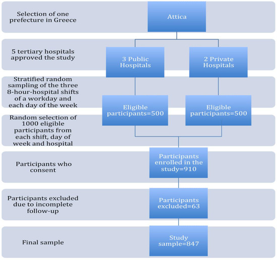 Flowchart of the multistage stratified random sampling method used in the study. (Attica/Greece 2020; n = 847).