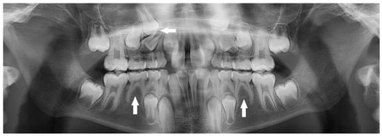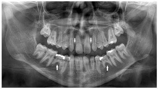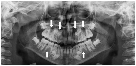 - Goya, H.A.; Tanaka, S.; Maeda, T.; Akimoto, Y. An orthopantomographic study of hypodontia in permanent teeth of Japanese pediatric patients. J. Oral Sci. 2008, 50, 143–150. [Google Scholar] [CrossRef] [PubMed]
