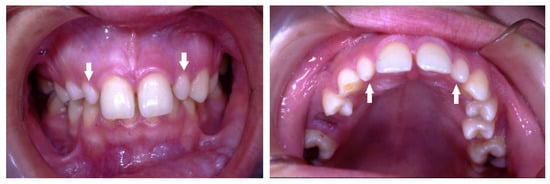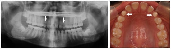 - Garib, D.G.; Alencar, B.M.; Lauris, J.; Baccetti, T. Agenesis of maxillary lateral incisors and associated dental anomalies. Am. J. Orthod. Dentofac. Orthop. 2010, 137, 732.e1–732.e6. [Google Scholar] [CrossRef]