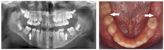 - Dhamo, B.; Vucic, S.; Kuijpers, M.A.; Jaddoe, V.W.; Hofman, A.; Wolvius, E.B.; Ongkosuwito, E.M. The association between hypodontia and dental development. Clin. Oral Investig. 2016, 20, 1347–1354. [Google Scholar] [CrossRef]