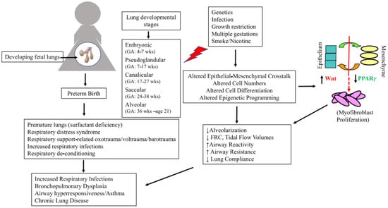 Although infants born extremely preterm, i.e., during the late canalicular and early saccular stages of lung development, have the most significant burden of early respiratory morbidity that predisposes them to the most significant risk for later pulmonary issues, a complex, intricate and protracted lung development process, starting from the early embryonic period and continuing into early adult years, renders the respiratory system to be vulnerable to insults throughout its developmental course. Furthermore, although the lung’s functional capacity increases throughout childhood and peaks at 20–25 years before starting its decline into old age, it is well established that the trajectory of its maturation is already established at birth. For example, maximal expiratory flow measured shortly after birth correlates with the forced expiratory volume in one second/forced vital capacity (FEV1/FEC) ratio into adult life [43]. In addition to the interruption of natural lung development due to PTB, the damaging effects from inadequate nutrition, respiratory infections and respiratory support, such as oxygen supplementation and invasive or non-invasive ventilatory support that extremely premature infants universally require for their extrauterine survival, adds to both short- and long-term respiratory consequences (Figure 1) [44]. These invariably include sub-optimal adult respiratory capacity, an increased predisposition to asthma, and accelerated decline in lung function, although the data are inconsistent between various studies. Furthermore, as outlined later, exposure to tobacco smoke/nicotine at any stage in the developing lung is detrimental [45].