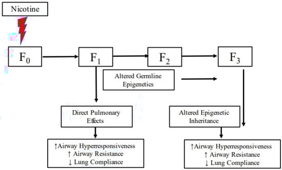 Given that it would take decades to follow multiple generations prospectively and since, in real life, it is almost impossible to control for all variables determining asthma, experimental models are the only realistic way to study the phenomenon of transgenerational transmission of asthma. As outlined next, that is what we and others have done. A murine model demonstrated that maternal tobacco exposure increased airway hyperactivity, airway resistance, and decreased lung compliance in offspring, which was then passed on to the next generation without tobacco exposure [145]. Even more convincingly, in an experimental rat model, airway hyperresponsiveness and asthma-related molecular markers were increased in the first-generation offspring exposed to nicotine and subsequent second and third-generation offspring without any subsequent exposure to nicotine beyond the F0 generation (Figure 2) [181,182]. Supporting this highly significant observation, nicotine-induced transgenerational inheritance of additional phenotypic and molecular traits has also been described in other models [115,183]. Additionally, since the offspring of smokers are more likely to smoke than nonsmokers [184,185], the effect of repeat smoke/nicotine exposure during a subsequent generation following exposure in F0 gestation on the asthmatic phenotype in F2 generation has been examined [114]. It was determined that nicotine exposure in F1 gestation following its exposure in F0 gestation causes a more robust asthma phenotype in the F2 generation, especially in males, compared to its exposure in only F0 pregnancy.