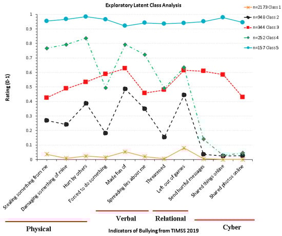 The most important finding was that five distinct profiles of bullying were observed, with differences in level and content. Besides being very low and very high in bullying classes (i.e., classes 1 and 5), three new, qualitatively different subgroups emerged (classes 2, 3, and 4). Class 3 appeared to be a medium leveled class, but what was striking about this class is that the levels were approximately equal across all four domains of bullying. This was notable, despite observing two emergent classes for which cyber levels were non-existent, despite above average (for class 4) or below average (class 2) levels of physical, verbal, and relational types of bullying experiences. These findings had both similarities and differences with past research. For example, low and high bullying experiences groups have been similarly observed in past research (see [61,62] reported) that up to 11% of the student population exhibited all types of bullying behavior. In the present study, this was reflective of the sum of the participants in classes 3 and 5. These two classes amounted to 501 students, which, in percentage, reflected 12.9% of the student population of fourth graders who participated in TIMSS in Saudi Arabia, and thus this finding has a striking resemblance to past research. Any bullying experiences are reported in around 60% of the student population in middle school [63] or 41% [64]. In the present study, summing up the participants in all classes except class 1 amounted to 44% of the national sample, much lower compared with [65], but similar to [64]. Furthermore, the present low levels of cyberbullying reported herein agree with past research where cyberbullying behaviors had the lowest frequency [66], but disagree with the findings by [31], in that between 1990 and 2009 cyber bullying levels increased. Interestingly, levels of cyber bullying are expected to increase by adolescence [67]. The present findings also disagreed with the profiling by [68], who reported lower levels of verbal aggression in fifth graders compared with the ones observed in the present study.