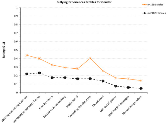 Another important finding was that gender significantly differentiated the profiles. For example, for the anchor profiles, low and high bullying were predominantly female and male, respectively. Thus, there was evidence of significant differences in the level of bullying across gender. Differences in content were also observed; for example, Class 3 had high levels of physical aggression (e.g., damaging property, forcing, and stealing) and this class was comprised of mostly males (63% vs. 37). This finding agreed with past studies, pointing to the high prevalence of aggressive incidences and perpetrator behaviors by boys compared with girls [61,69,70,71]. Item-level gender differences pointed to significantly elevated experiences of bullying for males compared with females across the board of bullying behaviors and types. This finding disagreed with past studies that reported a higher prevalence of relational bullying for females [72,73] compared with males; however, this difference could be a function of measurement differences or age. In the present study, relational bullying was assessed with a single item. Furthermore, there has been evidence that gender differences in bullying are moderated by age levels [27,28] or context [4,74,75], thus complicating the picture on the causes behind the observed differences in bullying across gender. The present study also has important implications for educational policy, and these are discussed next.