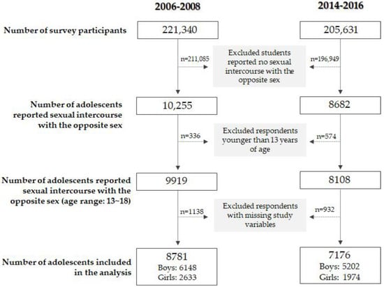 Respondents younger than 13 years of age were excluded from the analysis. It was decided that these individuals could have distinguished socio-environmental characteristics that required additional analysis (Table S1). A total of 336 students (205 boys and 131 girls) from 2006–2008, and 574 students (371 boys and 203 girls) from 2014–2016 pooled data were excluded. All excluded students were 12 years old; hence, students aged 13 to 18 years were included in the analyses. Students who had reported sexual experience but not at the age of sexual initiation were also excluded from the analysis. In addition, some cases that missed reporting school type, in which sex and school sexual composition did not match, and in which age and school type attending could not be matched at a common-sense level were excluded. The total number of analyzed respondents from the 2006–2008 pooled data was 8781 (6148 boys and 2633 girls), and that of the 2014–2016 pooled data was 7176 (5202 boys and 1974 girls). (Figure 1).
