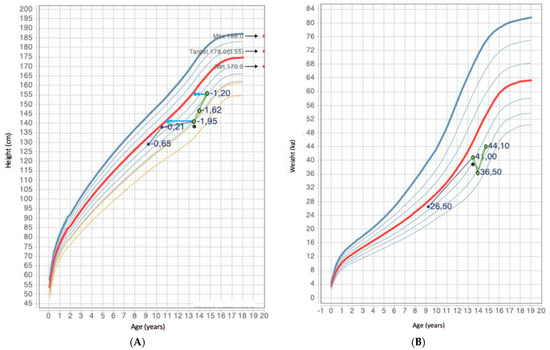 The growth assessment indicated a height of 141 cm (−1.95 SDS according to Tanner standards [4,5]) and weight of 41 kg. At the previous measurement, completed when the patient was 10 and a half years old, height was 138 cm. Comparison between the two measurements showed delayed, almost stunted, growth. The patient’s target height was 178.0 cm (0.25 SDS). During the X-ray, bone age was calculated as 11 years, according to Greulich and Pyle (Figure 2A,B).