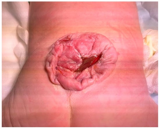 Our patient was born from the first regularly controlled pregnancy of young and healthy parents (father was 32 and mother was 27 years old). According to their familial history, there was no evidence of consanguinity. There was no history of previous pregnancies, still births, or abortions. Parents were non-smokers and did not consume drugs or alcohol. Since the confirmation of the pregnancy in the fifth week, mother had routinely supplemented with folic acid. In addition, there was no data of familial neurological diseases or spinal dysraphism. During the pregnancy, an enlargement of the lateral ventricles, oligohydramnion, and distended bladder were observed with ultrasound. The delivery of the baby was at term with an emergency section. A full-term male child was born with a birth mass of 3720 g, Apgar score 7/8, and a large lumbosacral meningomyelocele (Figure 1).
