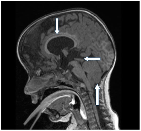 Non-enhanced sagittal MRI T1-weighted scan revealed a Chiari malformation type 2 (up arrow), hypoplasia of the corpus callosum (down arrow), and dysgenesis of the lamina tecti (left arrow).