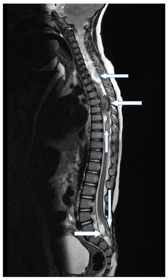 Sagittal MRI T2-weighted scan revealed spinal cysts in the thoracic (left arrows) and lumbar regions (right arrow), syringomyelia (up arrow) and tethered cord (down arrow).