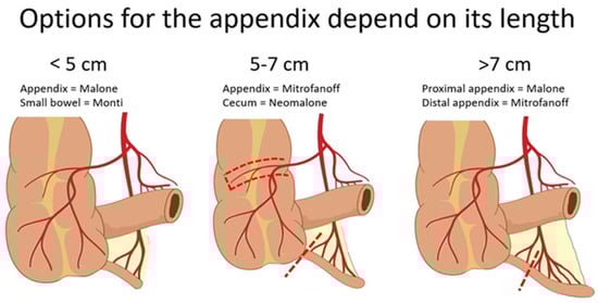 In multidisciplinary centers, preoperative planning is done in collaboration with urologists, which considers the needs of both colorectal and urology teams. Some patients with an ARM or spina bifida who need antegrade access for colonic emptying have associated urologic anomalies [20,21] and might require both antegrade flushes for bowel management and a Mitrofanoff channel for urinary access or ease of bladder emptying. From the urologic standpoint, the appendix may be needed for a Mitrofanoff and is the best conduit, superior to a Monti ileovesicostomy (made from small bowel), for managing urinary incontinence. In certain cases, the appendix can be shared using a split appendix technique, but this depends on the length of the appendix with sufficient vascularization and lumen width [22,23] (Figure 1). However, a split technique has been found to have a 47% complication rate and a more than twice higher risk of the need for future revisions, mostly due to isolated stomal stenosis (65%), in comparison with an isolated Mitrofanoff or Monti channel [24].