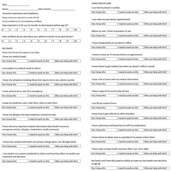 47. Cooley, W.C.; Sagerman, P.J.; American Academy of Pediatrics, A.A. of F.P., and American College of Physicians. Transitions Clinical Report Authoring Group Supporting the Health Care Transition from Adolescence to Adulthood in the Medical Home. Pediatrics 2011, 128, 182–200. [Google Scholar] [CrossRef]