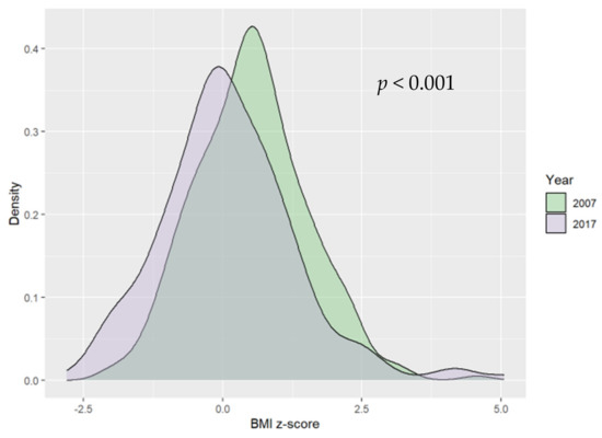 Overall, the BMI z-score was significantly lower in a group of children in 2017; however, among the children with overweight and obesity, the BMI z-scores were higher in 2017 than in 2007. Moreover, from the overview of Table 2, it is observable that in 2017, the values of the upper quartile of the BMI z-score in the group of obese children were higher, indicating the occurrence of a tendency towards higher values of the BMI z-score in obese children. Moreover, although no statistically significant differences in terms of prevalence of normal weight as well as excessive weight were observed, a tendency regarding a decrease in overweight and obesity rates and an increase in the prevalence of normal weight from 2007 to 2017 was visible. Results regarding differences in percentages of children in different weight categories (normal, overweight, and obesity) between 2007 and 2017 are similar to previous studies. In the study by Żegleń et al., which assessed differences in excessive weight prevalence in Polish preschool children between the years 2008 and 2018, the number of children with normal BMI was higher, whereas a decrease was noted in the number of children with overweight and obesity between 2008 and 2018 [31]. Furthermore, the study by Koebnick et al., which included a Southern California pediatric population, showed that the prevalence of excessive weight declined between 2008 and 2013 [32].