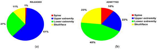 Fracture distribution by major anatomic location: (a) for those patients treated and released from the ED; (b) for those patients admitted to the hospital from the ED.