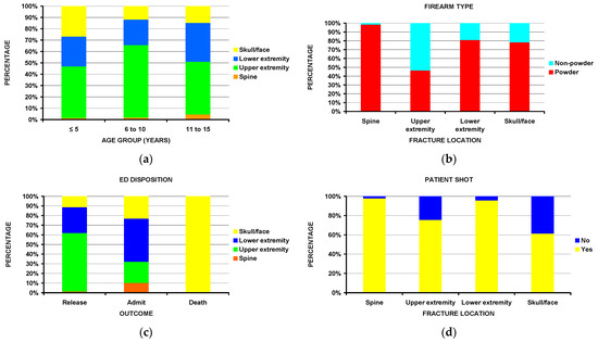 Notable differences (Table 3) include children ≤ 5 years of age sustained more skull/face fractures (Figure 2a). Most spine fractures, while rare, occurred in the 11–15-year age group. Fractures of the upper extremity accounted for 58.6% of all the fractures in the 6–10 age group. Nearly all spine fractures (98%) were associated with powder firearms (Figure 2b). Patients with lower extremity fractures were more commonly admitted to the hospital compared to those with upper extremity fractures; the few deaths occurred exclusively in those with fractures to the skull/face (Figure 2c). While most of the patients sustained a gunshot wound (i.e., were shot), nearly all of those with spine fractures were shot, while 39% of those with skull/face fractures were not shot (Figure 2d). Other statistically significant differences existed by race, perpetrator, incident locale, and injury intent.