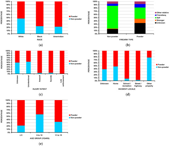 Differences between powder and non-powder firearms: (a) by race (p = 0.0005); (b) by perpetrator of the injury (p < 10−4); (c) by injury intent (p < 10−4); (d) by incident locale (p < 10−4); (e) by age group (p = 0.006).