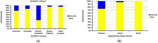 Differences between being shot or not. (a) By incident locale (p < 10−4); (b) by disposition from the ED (p < 10−4).