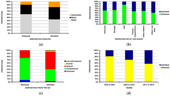 Differences by disposition from the ED: (a) by race (p = 0.011); (b) by perpetrator of the injury (p = 0.0006); (c) by intent of the injury (p < 10−4); (d) by year time span (p = 0.004).