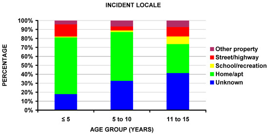 We noted that powder firearms were responsible for the majority of the fractures in the ≤5 and 11–16-year-old groups (78.7% and 67.1%) but only 44.1% for the non-powder firearm group (Figure 3e) and that the majority (63.3%) of those in the ≤5-year-old group occurred at home (Figure 6). This confirms and supports the need for firearms in the home to be safely stored and locked and away from children [44,45,46]. It has been estimated that even in 2020 that 4.6 million US children live in homes with at least one loaded and unlocked firearm [47]. The issue of gun ownership is very emotional in the US population, and in a recent study [48] gun owners with children were more likely than those without children to feel that guns make them feel more valuable to their families. Thus, acknowledging parental motivations for gun ownership is a pivotal educational component toward firearm injury prevention. However, the initial analyses did not uncover if this particular group in this study was injured unintentionally by the child or others. We, therefore, performed detailed analyses of the perpetrator and incident locale by the three age groups. In the ≤5-year-old age group, 90.8% of the fractures were self-inflicted and occurred at home; this number was 29.6% for the 6–10 and 18.4% for the 11–15 year old age groups (p < 10−4). Therefore, it can be concluded that young children are exceptionally vulnerable to accidental dislodging of an unlocked and loaded gun left at home, furthermore, emphasizing the importance of gun safety around young children.