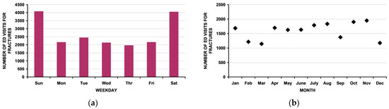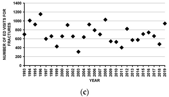 Temporal variability in the number of ED visits for fractures in children < 16 years old: (a) by day of the week. Note the increased number of ED visits on the weekend); (b) by month. Note that there is no apparent pattern. There was no change by month upon linear regression analysis: r2 = 0.057, p = 0.45. Additionally, cosinor analysis [37,38] demonstrated no rhythmic pattern as seen in many other pediatric non-firearm injuries [39,40,41]; (c) by year from 1993 through 2019. There was no change over time upon linear regression analysis: r2 = 0.05, p = 0.26.