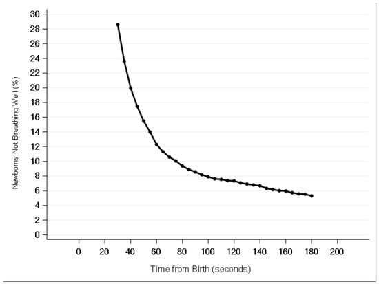 Among newborns at facility A (where we gathered observational data on both breathing and non-breathing newborns), we observed a steep decline in the percentage of non-breathing newborns between 30 s and 60 s after birth, followed by a change in the slope from approximately 90 s onwards (Figure 2). Among newborns at facility A, 28.1% were not breathing well at 30 s and 12.1% were not breathing well at 60 s after birth. At Facility A, the rate of BMV was 2.0%. Among all newborns in the trial not breathing well at 60 s, 19.7% eventually received BMV.