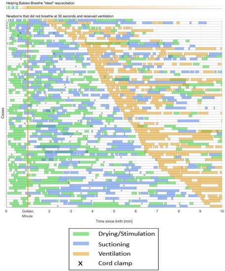 Despite a decade of literature evaluating the impact of HBB, a gap remains in our understanding of the implementation of resuscitation steps following training. Most reports of resuscitation practices focus on timely BMV. A meta-analysis of four HBB studies demonstrated the rate of BMV within the Golden Minute increased by more than two and a half times after training []. Despite this increase, up to one third of BMV episodes were still initiated beyond the Golden Minute []. Two meta-analyses of HBB studies demonstrated no change in the frequency of use of stimulation, suction, or BMV [,]. Little is known about the initiation time, duration, and repetition of stimulation and suction and the duration and continuity of ventilation following training [,,,,]. Additionally, previous studies have not provided details on the order in which providers implement resuscitation steps. Resuscitation practices that deviate from HBB may be less effective. A detailed understanding of these variations may assist educators in developing alternate strategies to maximize the impact of evidence-based resuscitation.