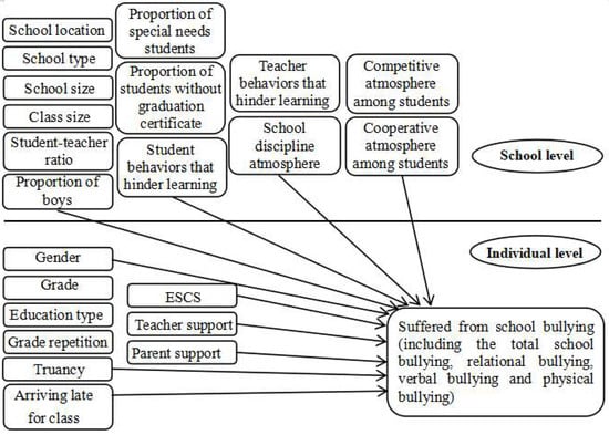 In conclusion, it can be seen that school bullying is affected by various factors of individuals, families, and schools, but there have been some contradictions among past studies, such as age and school type, which may be related to sampling or research methods. In addition, few studies have explored the various factors influencing bullying by combining different levels of data. When discussing this topic, these influencing factors should be considered comprehensively, but different levels cannot be analyzed at the same level, which leads to analytical bias. When facing these data from different sources, a multilevel analysis method should be used for an accurate analysis.