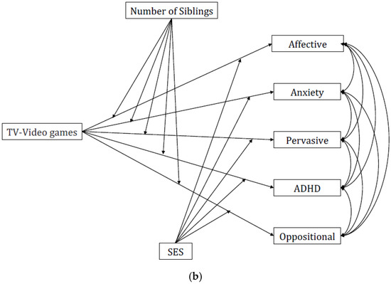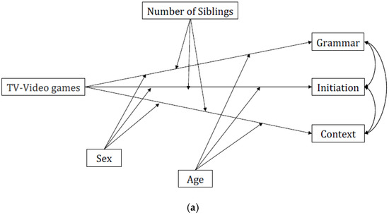 Moderation effects were tested using Structural Equation Modeling as implemented in the Mplus 8.1 software package [56]. The chi-square statistic, the standardized root-mean-square residual (SRMR), the root-mean-square error of approximation (RMSEA), and the comparative fit index (CFI) were used to determine how adequately the data fit with the chosen models [57]. Moderation effects were checked for non-normality in terms of the product coefficient by applying the 5000-bootstrap assessment technique [56]. Confidence intervals of moderated associations not containing zero were indicators of significant moderation pathways [58,59]. A more stringent significance level (i.e., 99%) was applied to control for multiple testing effects. Based on the correlation matrix, two multiple-moderator models were tested: (1) the direct associations between activities carried out by the child during the COVID-19 pandemic’s first lockdown (i.e., TV–Video games) and language skills (Structural Language, Initiation, and Context) and the moderation effects of some of the lifelong variables (i.e., age, sex, and number of siblings) (Figure 1a), and (2) the direct associations between activities carried out by the child during the COVID-19 pandemic’s first lockdown (i.e., TV–Video games) and emotional–behavioral traits (Affective, Anxiety, Pervasive Developmental, ADHD, and Oppositional Defiant) and the moderation effects of some of the lifelong variables (i.e., SES and number of siblings) (Figure 1b). The full model’s findings were reported.