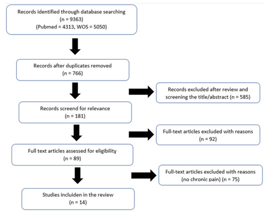 The selection process of relevant articles is presented in Figure 1. The initial search conducted in PubMed and Web of Science databases led to the collection of 9363 articles. After the removal of duplicates, the remaining articles were 766. These articles were then screened by title and abstract and inclusion/exclusion criteria were applied, thus collecting 181 articles for full-text selection. In a first step, 92 articles were excluded. These included the following: (I) articles that were not cross-sectional studies and (II) articles where the healthcare professionals were students. Finally, although we found articles mentioning pediatric chronic pain, these were excluded since they referred to pain due to palliative care or oncologic processes. After the final screening, 14 articles remained available for inclusion.