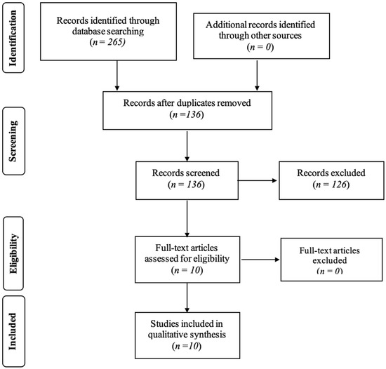 The research conducted on the PubMed, Scopus, and Web of Science databases led to a total of 265 articles (83 on PubMed, 97 on Scopus, and 85 on Web of Science). After the process of removing duplicates, a title and abstract analysis was performed for 136 articles. This process led to the exclusion of another 126 articles. Ten studies were included in the full-text analysis, and all of them were then included in the final systematic review.