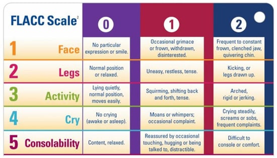 - Merkel, S.I.; Voepel-Lewis, T.; Shayevitz, J.R.; Malviya, S. The FLACC: A behavioral scale for scoring postoperative pain in young children. Pediatr. Nurs. 1997, 23, 293–297. [Google Scholar] [CrossRef]
