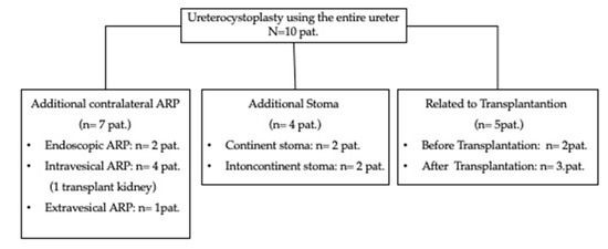 If necessary, the patient simultaneously received a continent (Mitrofanoff-stoma) or incontinent (vesicostomy) stoma as well as an antireflux plasty (ARP) of the contralateral ureter. Two patients had received a kidney transplant prior to UCP, while three patients were augmented in preparation for a transplant. Detailed information is shown in Figure 2.