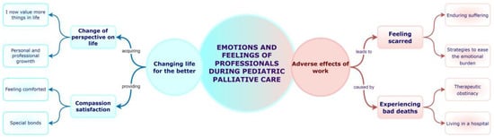 In addition, negative emotions and feelings emerged, such as grief, anguish, sadness, and suffering, that were derived from care, but not only in the palliative context. The professionals alluded that the hardest experiences of “bad deaths” were experienced outside palliative care, mainly in oncology or pediatric intensive care units. The concept of a “good death” is of great importance in PPC [48]. Compared to adults, there is less information on what a “good death” means for a child, and the available studies focused on children with cancer [48,49]. Our study provides relevant information, drawing on the experience of the most specialized professionals in pediatric end-of-life care, which contributes to fill this knowledge gap, shedding light on factors and characteristics that may contribute to a negative death for children and their families.