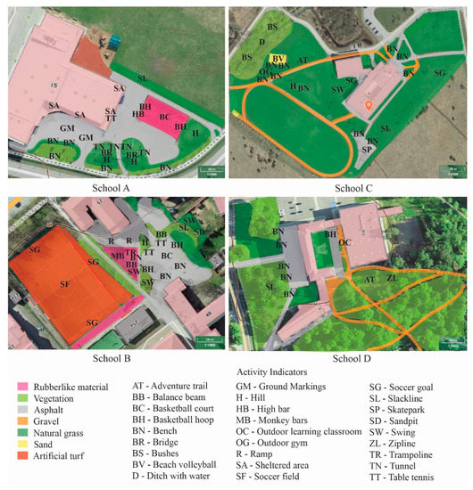 Figure 1 presents the schoolyard mapping cases from each school. School A was located in a city in the southern part of Estonia. The landscape was mainly flat with three artificially made small hills covered with natural grass and some vegetation like trees separating the schoolyard from the road. A large part of the schoolyard was covered with asphalt, which had some markings allowing students to engage in different games and activities. Asphalt also afforded the opportunity for students to ride scooters, bicycles, or skateboards in the schoolyard. In addition, the schoolyard included a basketball court, slackline, a few benches, table tennis, two tunnels going through two of the hills, a bridge connecting two of the hills, and a sheltered area in front of the school. The schoolyard provided opportunities to develop basic motor skills like running, jumping, walking, crawling, balancing, and climbing. Students also had access to different equipment, like balls and rackets, that afforded throwing and catching. Potential hazards of the schoolyard included not having a fence and a road passing right by the schoolyard.