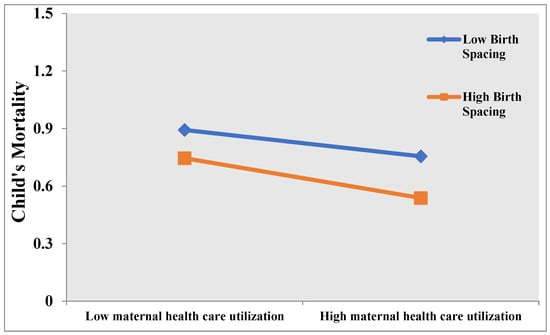 Child mortality was considerably decreased (OR = 0.801) by the interaction impact of birth spacing and MHCS. The interaction effects of birth spacing and MHCS on child mortality were further illustrated using slope analysis (Figure 1). High birth spacing had a greater negative slope of the curve relating maternal health care services to child mortality than low birth spacing. Increasing the time between births is suggested to improve the relationship between MHCS and child mortality. The influence of MHCS on child mortality became more prominent as birth spacing increased.